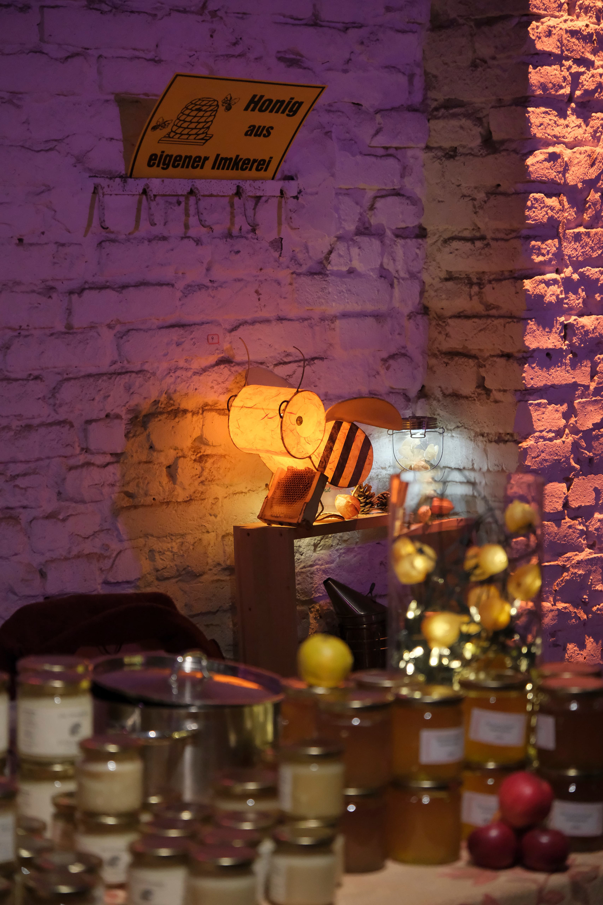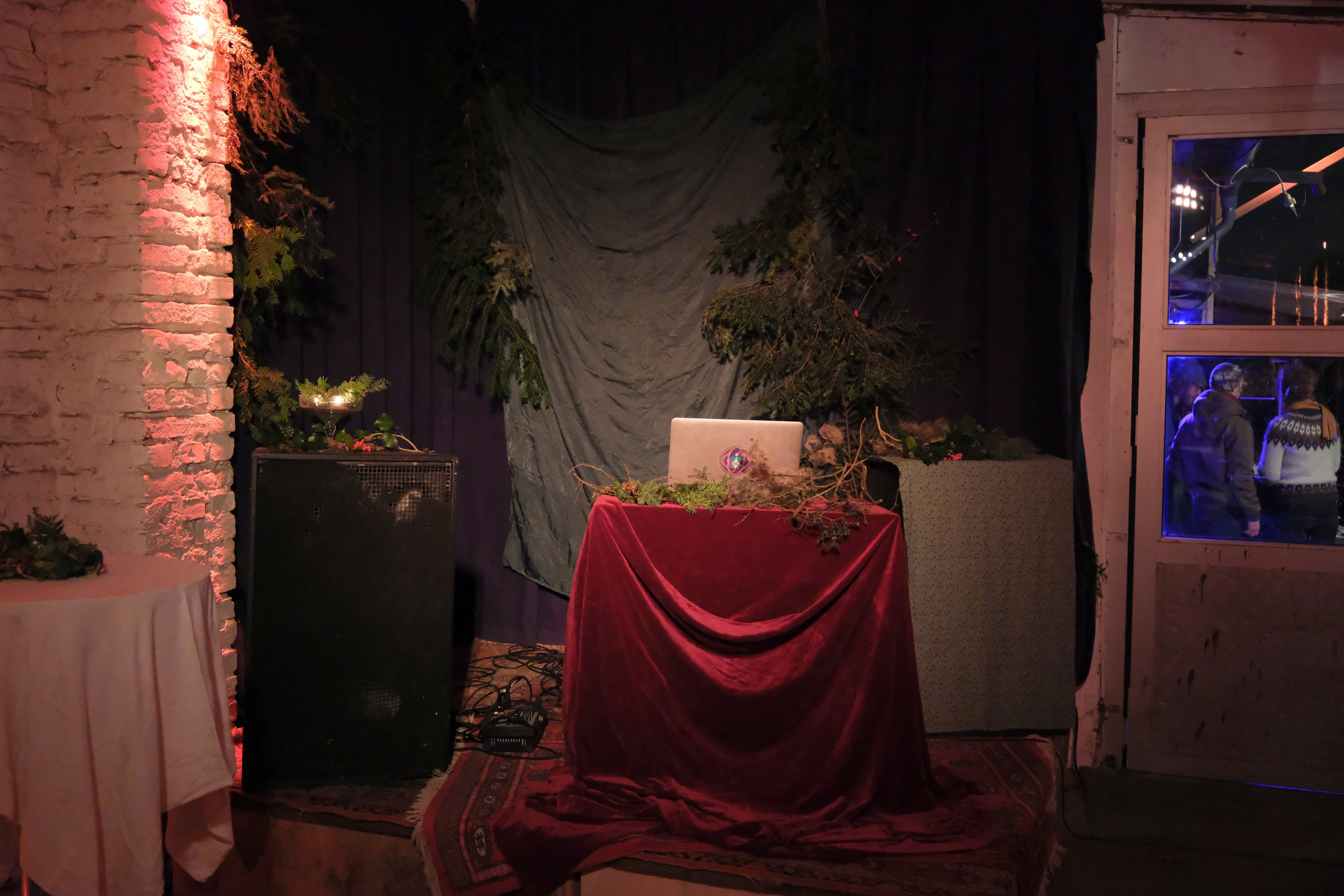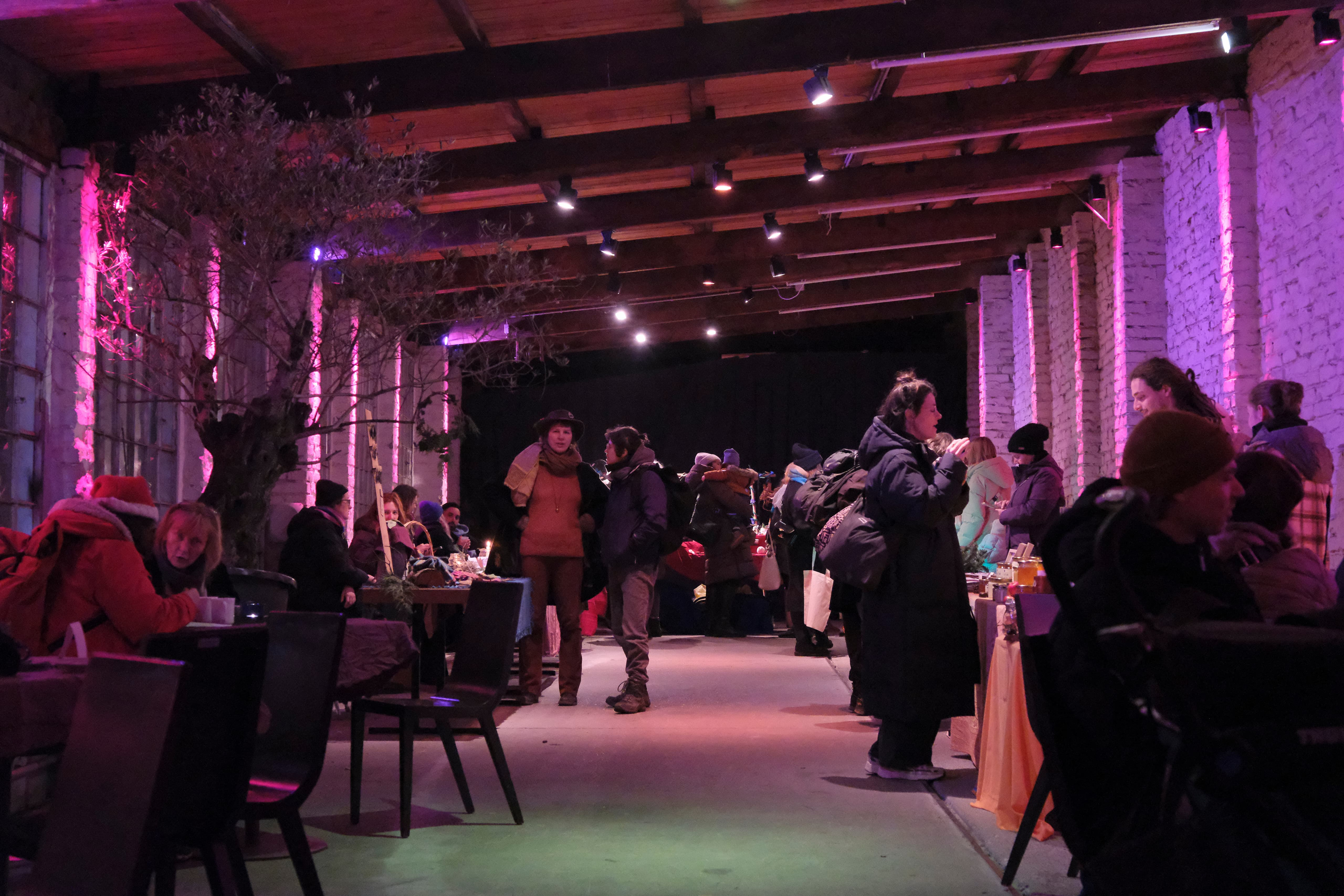 1 - The floor. Since the building is going uphill (photo taken from the entrance of the building) the goal there was to make sure that no-one would stumble on the way up. The lights randomly change between red and green (much more subtle in person) since this was a Christmas Market. Please note - these were much less bright than depicted here.
