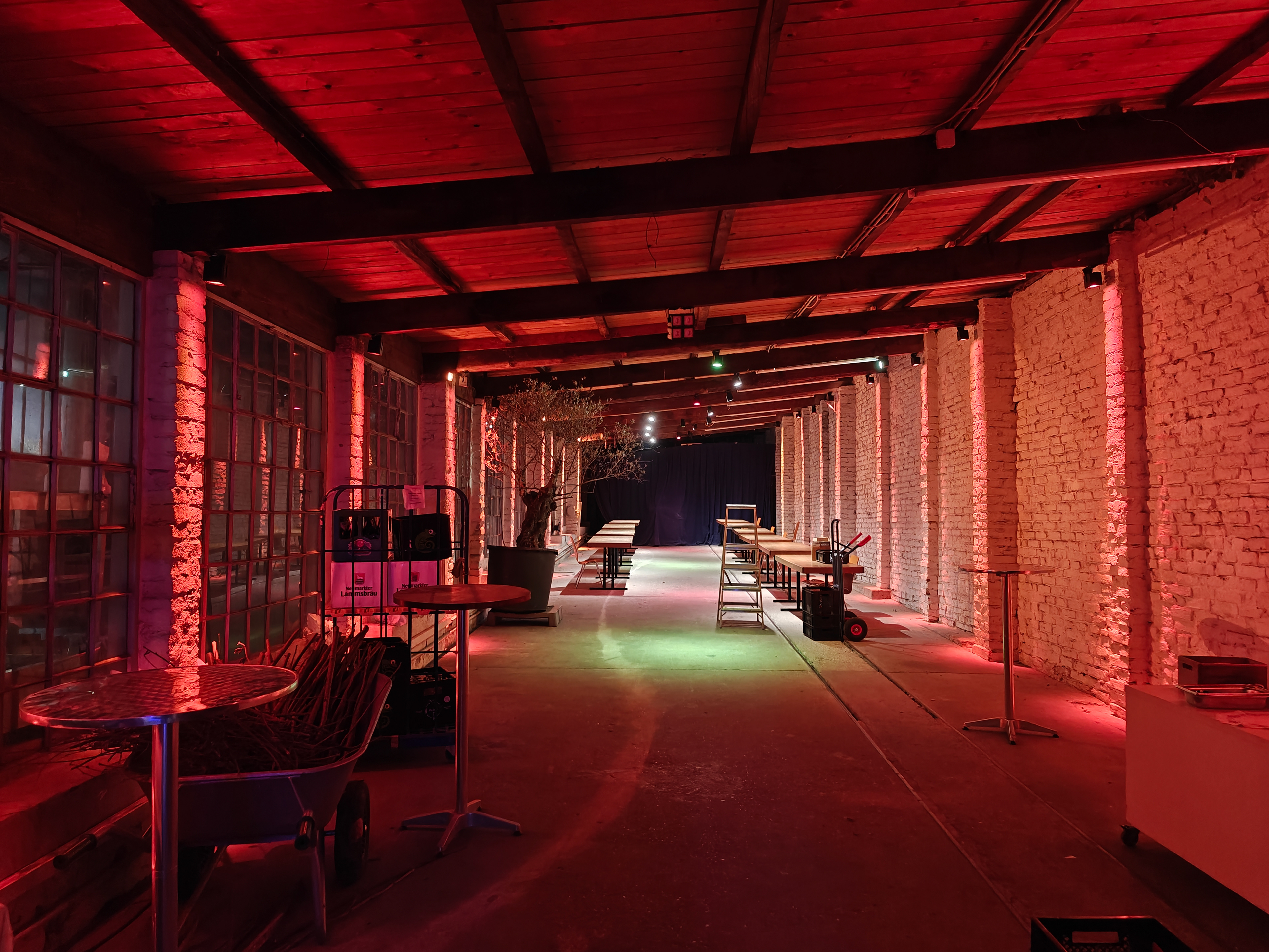 2 - Spotlights on the beams on the walls, meant to highlight the old brick walls of the historic building (It's an old rope factory). They changed colors with an upwards motion, from the bottom light (closest to the camera) to the top light, at 45 sec. intervals (the animation takes about 10 seconds for all of the lights). This was meant to draw the guests inside, making them immersed in the event. After they were inside - the other parts of the lighting came into play.